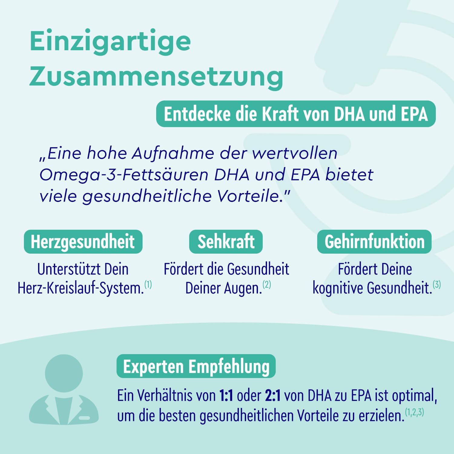 GEHIRN-, SEHKRAFT UND HERZ-FUNKTION* – Eicosapentaensäure (EPA) und Docosahexaensäure (DHA) tragen zu einer normalen Herzfunktion bei. Darüber hinaus trägt DHA zur Erhaltung einer normalen Gehirnfunktion und zur Erhaltung normaler Sehkraft bei.*